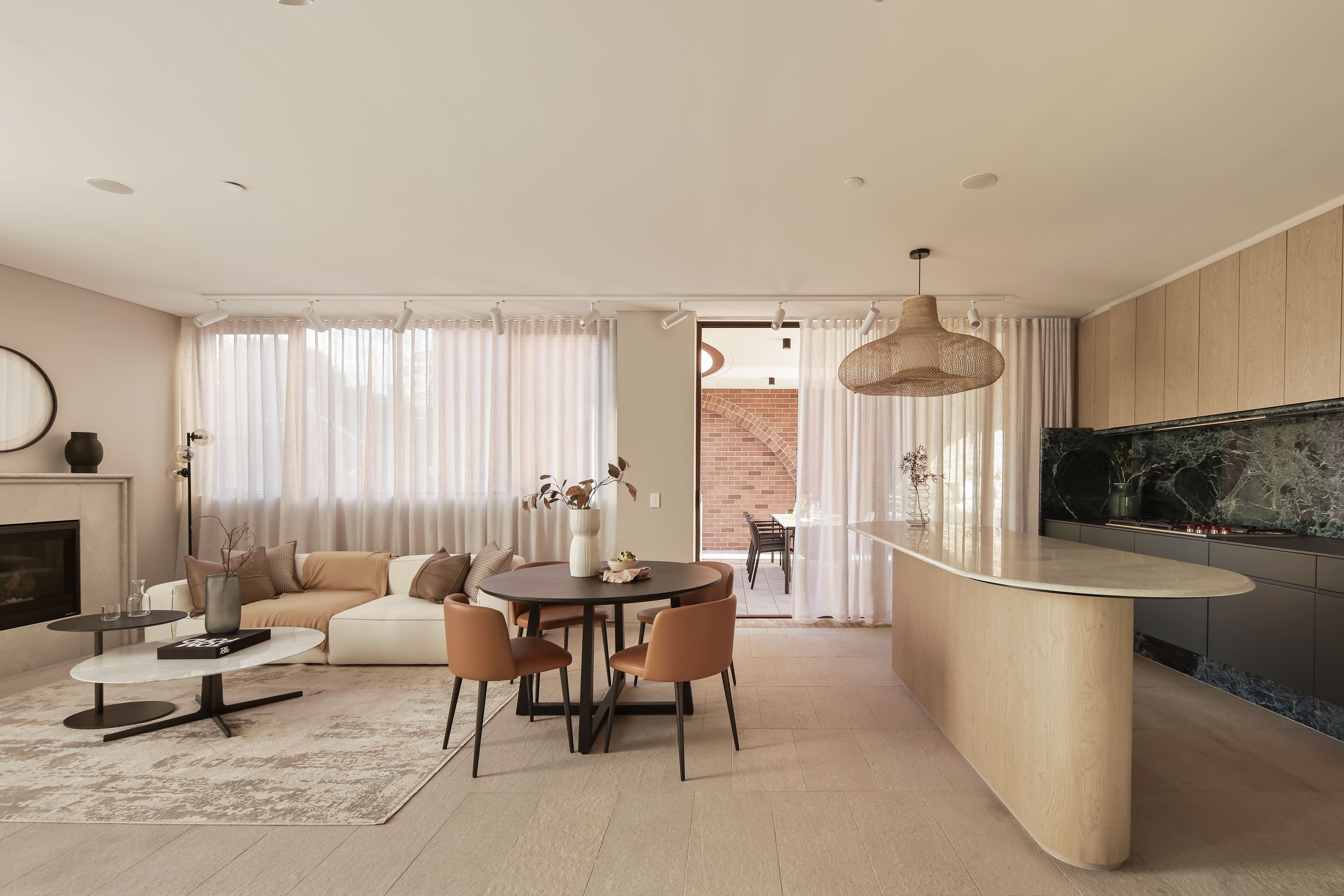 Inside, each residence offers an artfully composed sense of comfort and refinement. Spacious living areas are warmed by natural light, and in 1 Marriott Street, an ambient central fireplace brings an inviting atmosphere that transforms with the seasons. A discreet yet sophisticated cocktail bar, concealed behind leather-bound pocket doors, is fitted with a Sub-Zero wine fridge, perfect for storing and showcasing a private collection of fine wines and spirits.